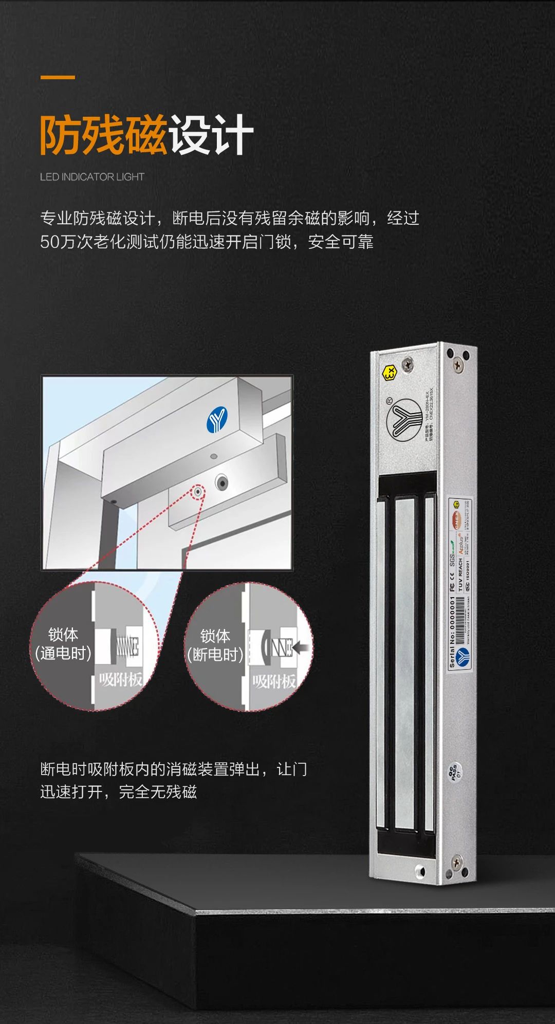 兩種材質,結構簡單、無磨損、便于安裝維修,發生危險時斷電解鎖便于逃生,可靠性高。