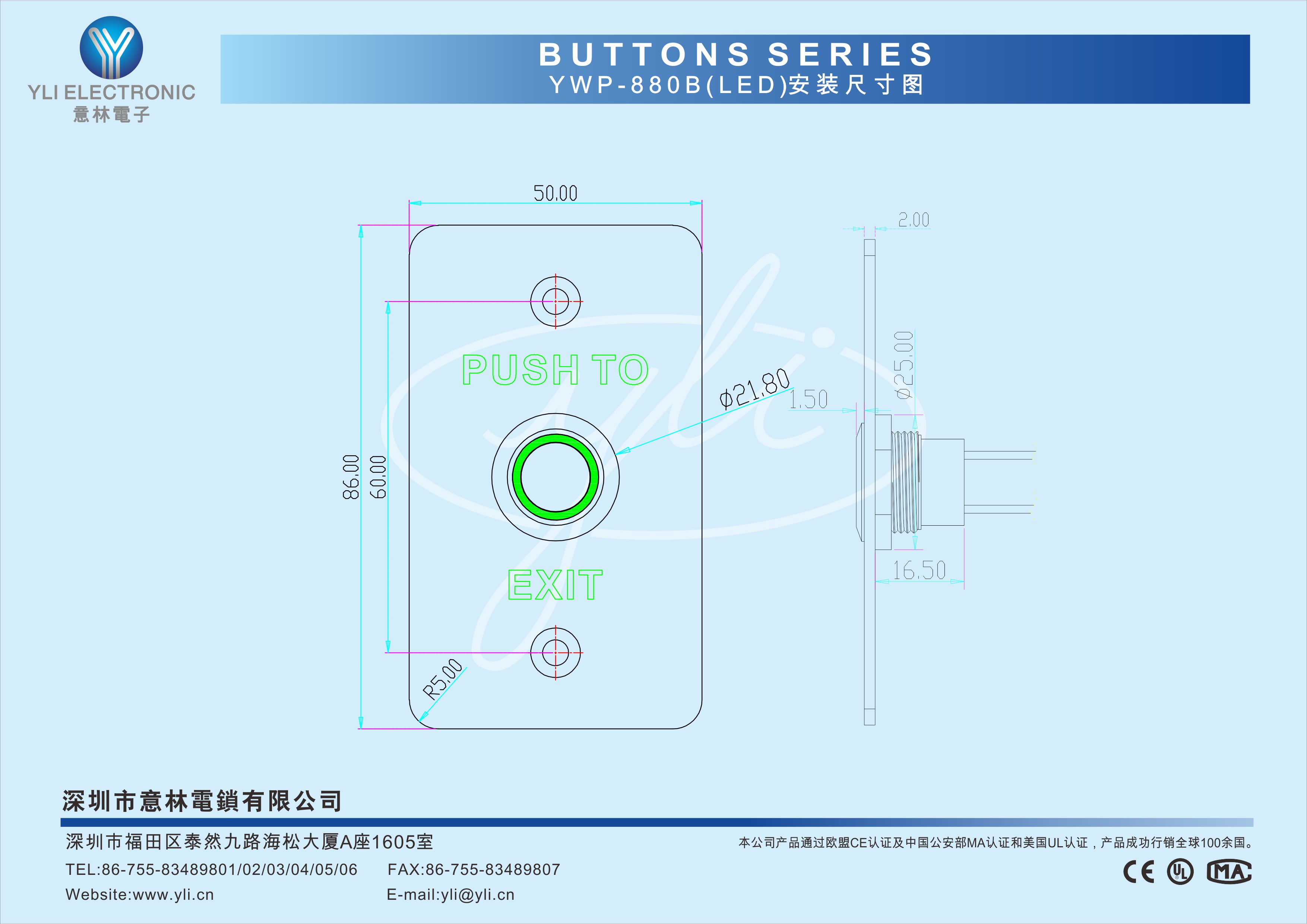 YWP-880B(LED)是一款防水型按壓式門禁專用開關(guān),防雨水設(shè)計,LED燈顯示:通電亮燈,常亮綠色。面板304不銹鋼拉絲工藝處理,金屬材質(zhì)按鈕,經(jīng)CNC車床加工后拋光而成,10萬次耐用測試合格,堅固耐用,產(chǎn)品美觀。門禁系統(tǒng)配套的最佳選擇。