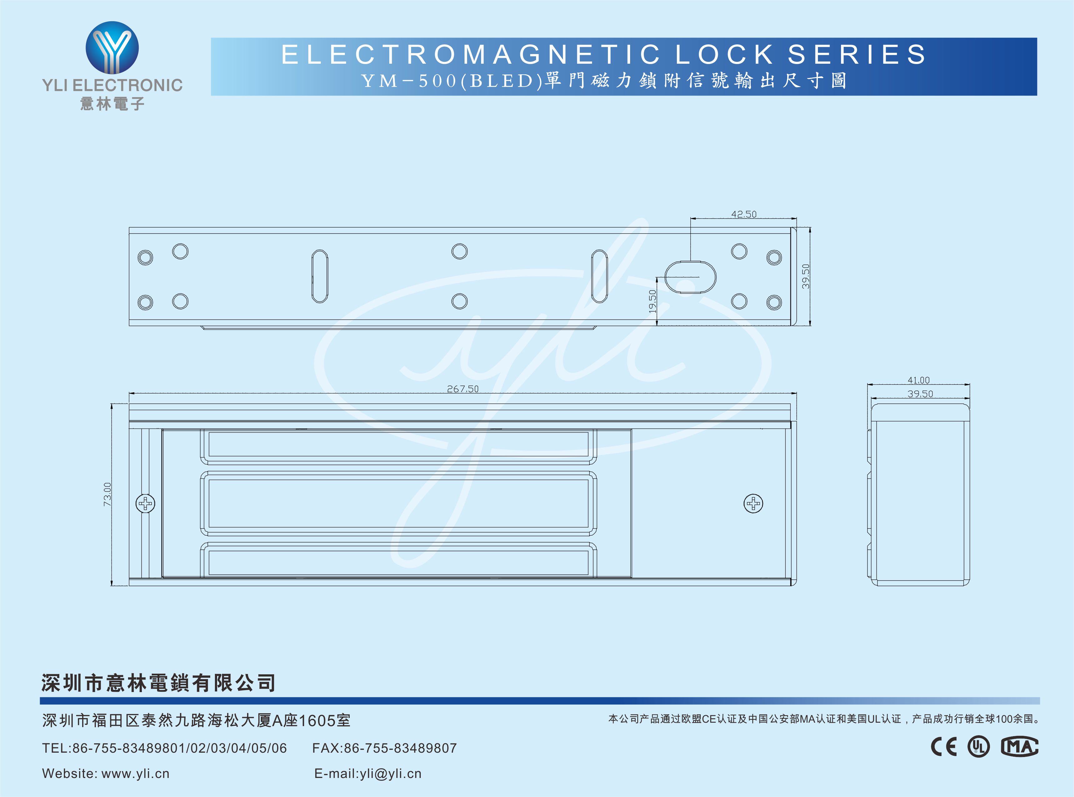 直線吸力:500kg±10%適用溫度:-30 ℃ ~ + 66℃適用濕度:0~95%相對濕度防腐性能:通過 240 小時鹽霧測試鹽霧拉力:240小時鹽霧測試后拉力衰減5%內耐用性能:通過 100 萬次循環測試耐用拉力:100萬次耐用測試后拉力衰減5%內沖擊性能:承受 45J鐵錘撞擊5 次測試殘磁性能:少于 0.5 秒消磁開鎖過壓測試:125%額定電壓 24H沒有損壞低壓測試:85%額定電壓保持相應拉力鎖體阻燃: 阻燃樹脂灌封,防火等級:V-0 (SGS實驗室)鎖芯加強: 激光焊接提高結構強度質量保證: 三年質保通過多國認證,符合國際安全標準